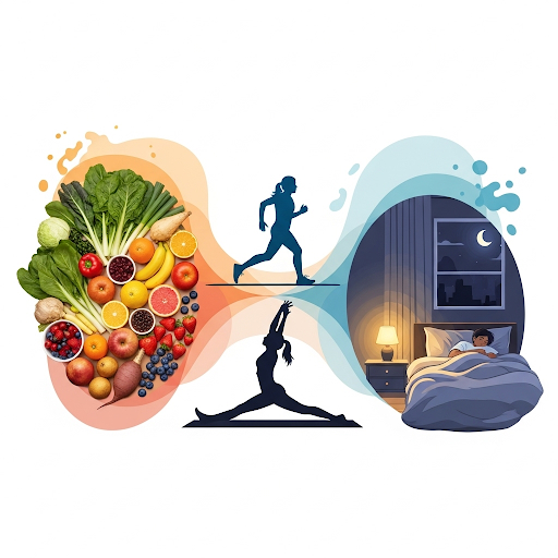 규칙적인 운동, 건강한 식단, 충분한 수면 등 면역력 관리를 위한 다양한 요소들이 조화롭게 어우러진 이미지를 표현했습니다.