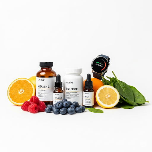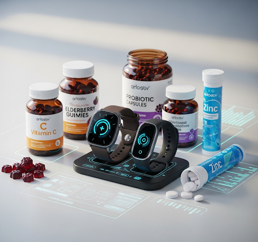 다양한 형태의 건강식품과 첨단 기술(스마트워치 등)이 함께 있는 모습입니다. 면역 시장의 혁신적인 변화를 상징합니다.