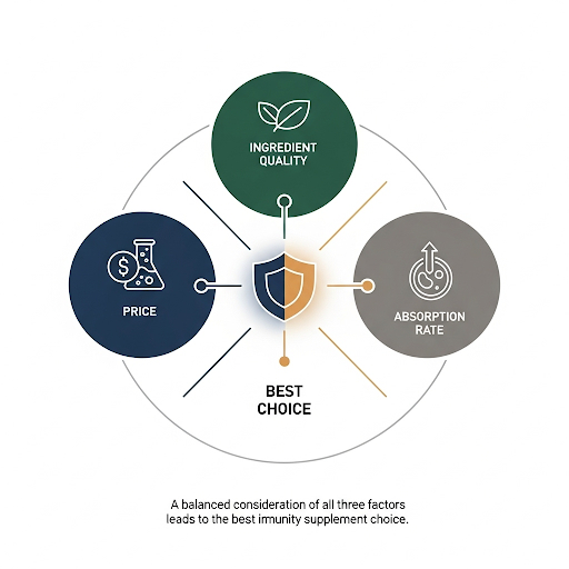 면역 관리 제품을 선택할 때 고려해야 할 다양한 요소들(가격, 품질, 흡수율 등)을 보여주는 도표입니다. 복합적인 관점의 중요성을 강조합니다.