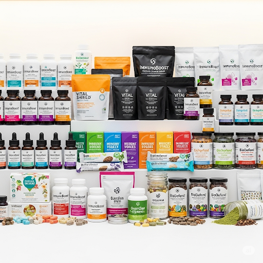 다양한 종류의 면역력 건강식품들이 진열되어 있는 모습입니다. 선택의 폭이 넓음을 보여줍니다.