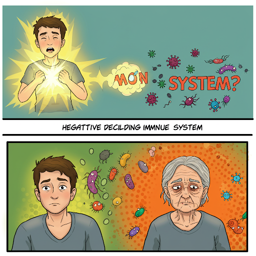 • 면역 기능이 떨어지면 몸속 염증 반응이 증가하여 만성 염증성 질환(심혈관 질환, 관절염 등)이 발생할 가능성이 높아집니다.